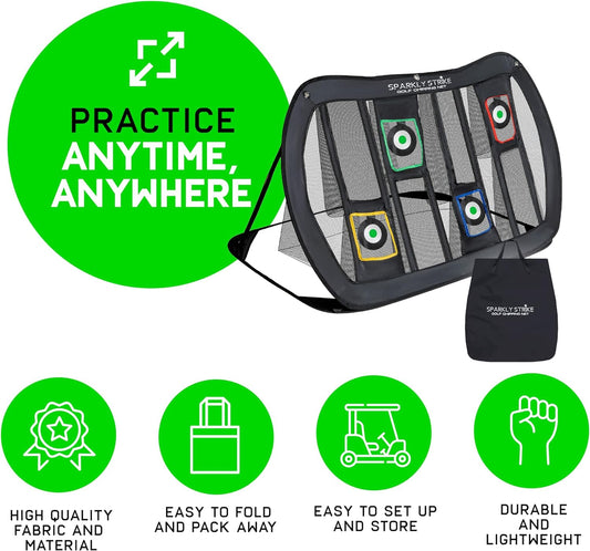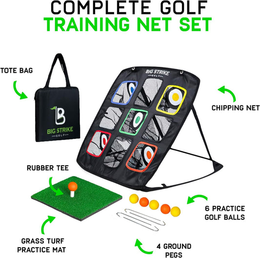 Big Strike Golf - Golf Chipping Net Combo with 5 Targets - Chipping Turf Mat - Rubber Tee - 6 Practice Balls